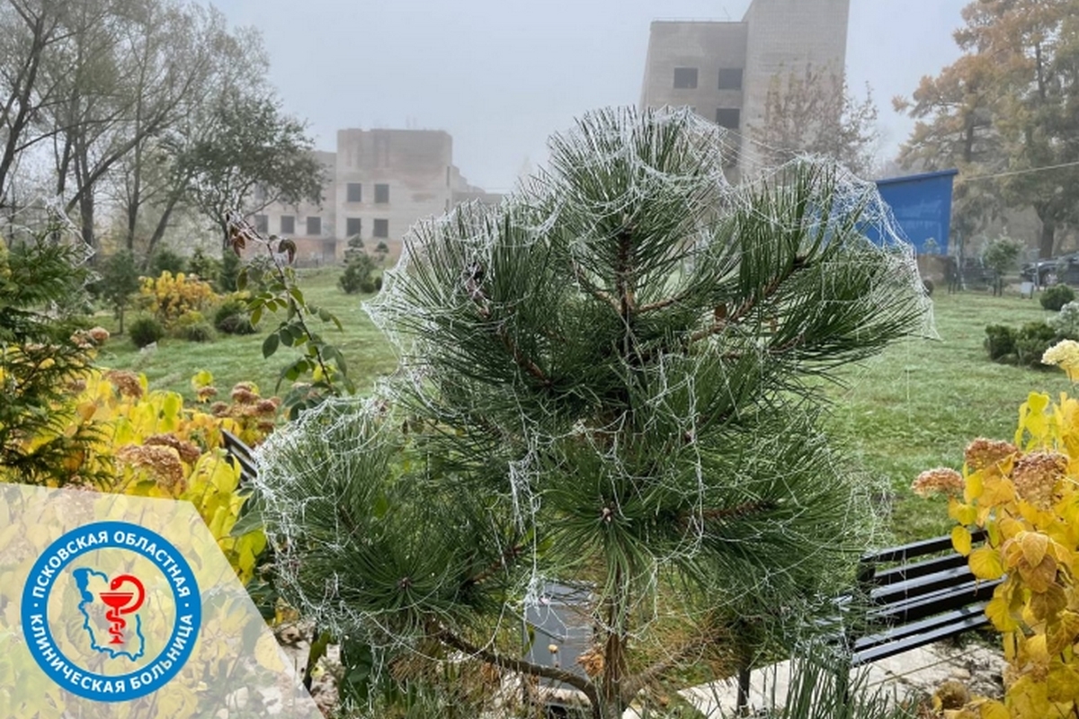 Наш внутренний дворик терапевтического корпуса филиала «Великолукский межрайонный» сегодня преобразился, словно по волшебству! Первые осенние заморозки окутали деревца тончайшим кружевом изморози, превратив обычные ветви в настоящие произведения искусства.